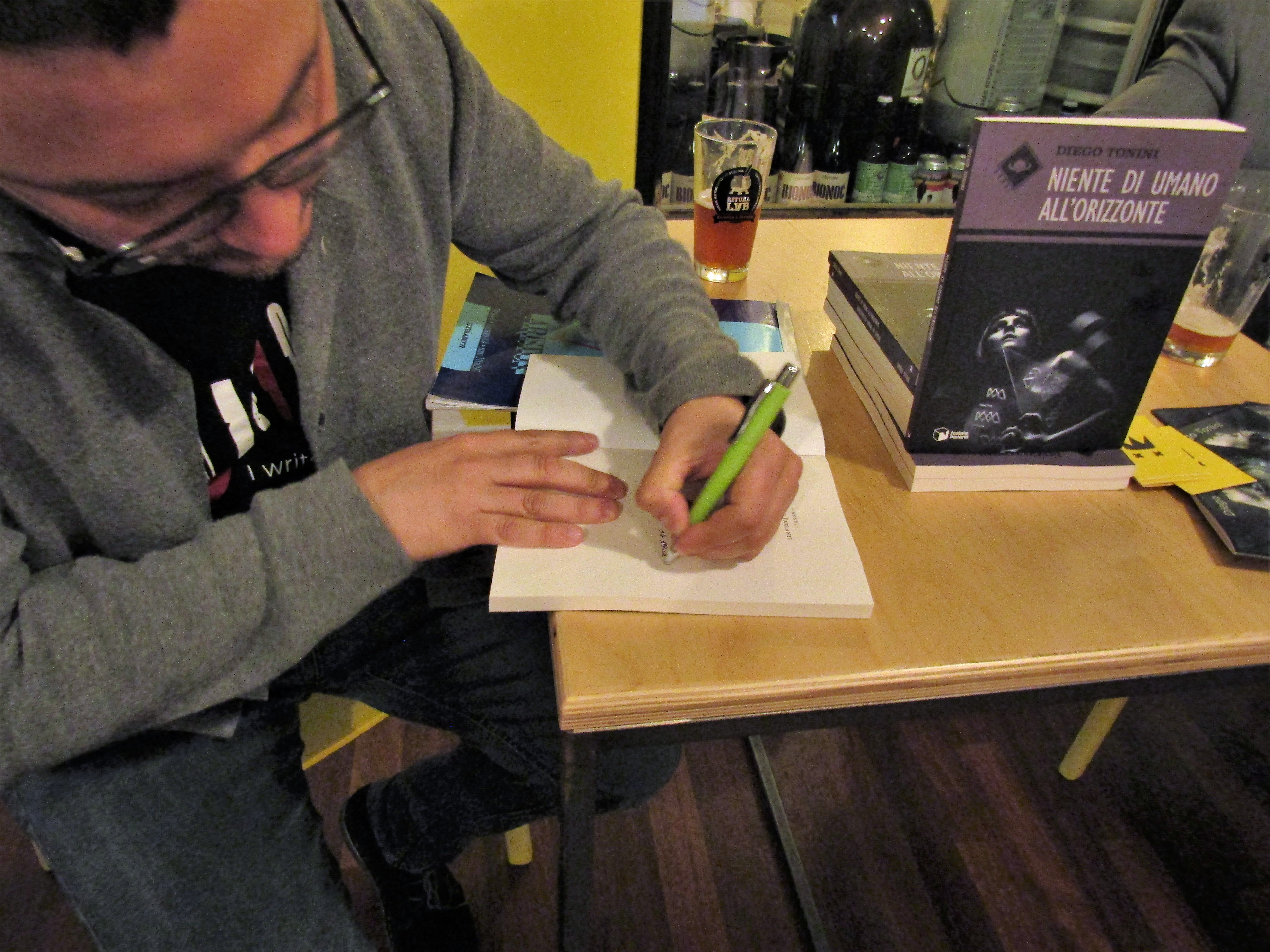 Certo, il luogo dell’evento ha fatto la differenza: se dici a qualcuno: “vieni a sentirmi che presento la mia raccolta di racconti in libreria” quello si aspetta die ore di noia e bla bla bla, se invece cambi le prime quattro vocali e dici BIRReria, quello pensa: male che vada mi sbronzo come non ci fosse un domani, e viene a vederti.